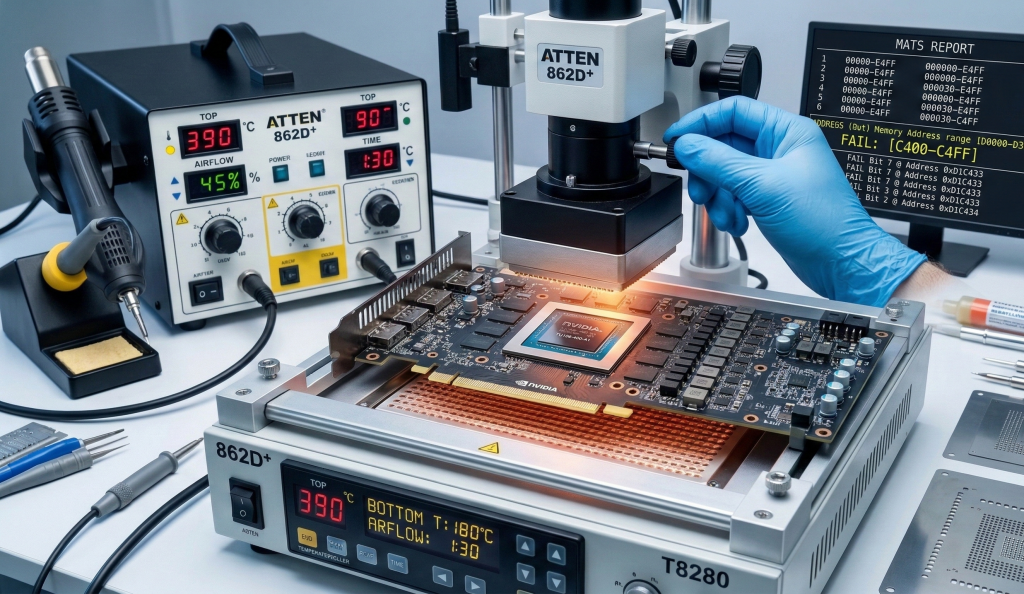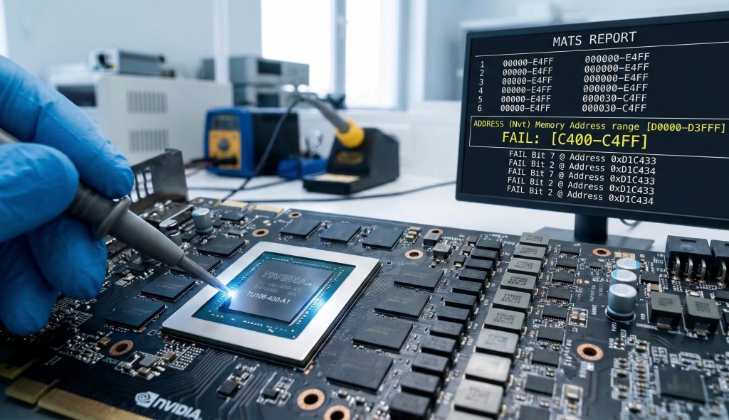 - Testeo de Memoria Dedicado (MATS/MODS y equivalentes): Usamos software de diagnóstico de ingeniería (fuera del entorno Windows) para interrogar a cada chip de memoria VRAM de forma individual. Así sabemos exactamente qué chip (A1, B0, C1…) está fallando.